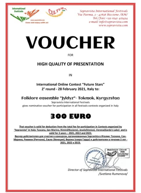 "Жылдыз" фольклордук ансамбли бул сынакта "Муха-Цокотуха" бийи менен “Эстрадалык бий” номинациясында катышкан. Ансамблдин жететекчиси - Наталья Быкова. Бул бий Парижде өтө турган эл аралык сынакка катышуу үчүн 2020-жылы даярдалган. Бирок пандемияга байланыштуу иш-чара өтпөй калган. Мындан улам, ансамбль Италияда өтүүчү эл аралык онлайн сынакка катышуу үчүн видеолор жана сүрөттөрдү жөнөткөн. Сынак аяктаган соң, 1-орунду алгандыгы жана 300 еврого ваучер берилгендиги тууралуу маалымат электрондук кат менен келген.