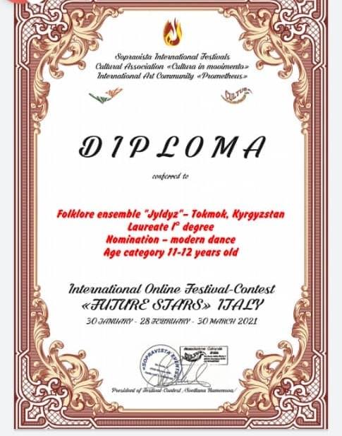 Маалыматка караганда, Италия эл аралык “Cultura in movinento" онлайн сынагын уюштурган. Аталган сынакка Кыргызстандан катышкан Чүй райондук маданият үйүнүн "Жылдыз" бийчилер 1-орунду багындырды. Сынакка жалпысынан 37 ѳлкѳ катышып, катышуучулардын курагы 11-12 жашты түзгөн.
