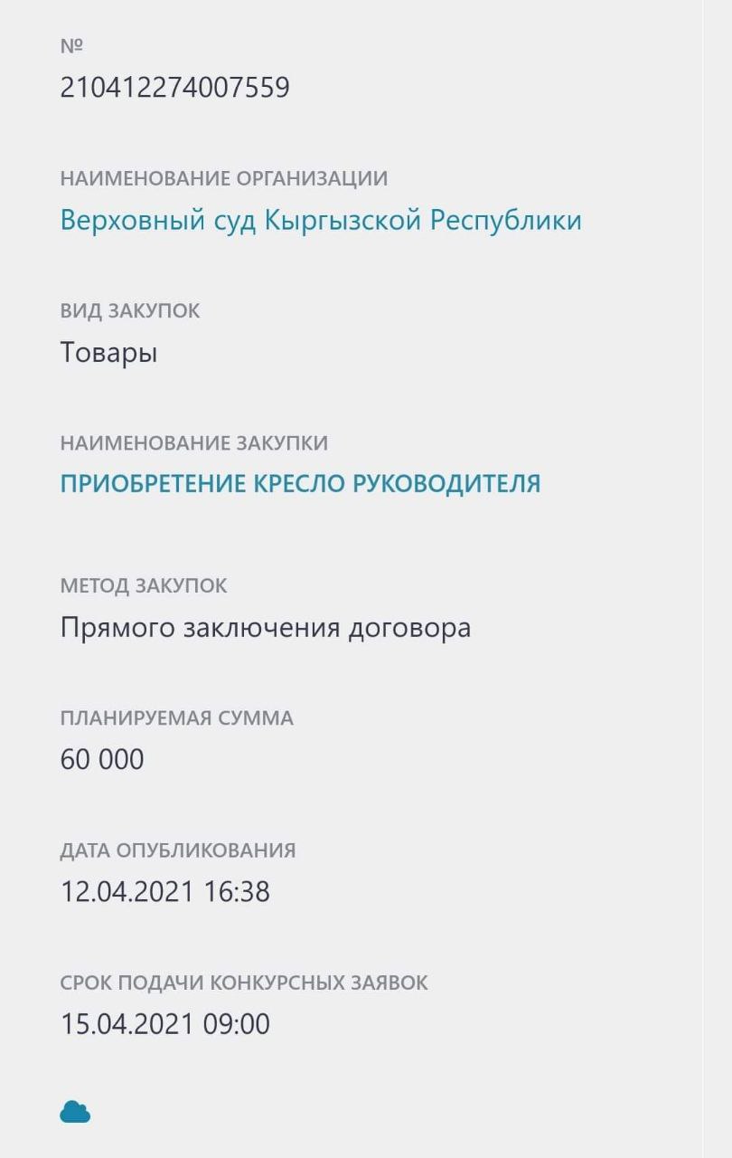 Жогорку Сот жетекчиге кресло сатып алууга тендер жарыялады. Бул тууралуу Мамлекеттик сатып алуулар порталына жазылганын соцтармак колдонуучулары жазып чыкты.