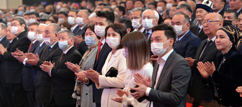 Президент Садыр Жапаровдун президенттик кызматка киришүү аземине үй-бүлөсү, туугандары да күбө болушту. Биринчи катардагы отургучтардын ортосунда жуба...