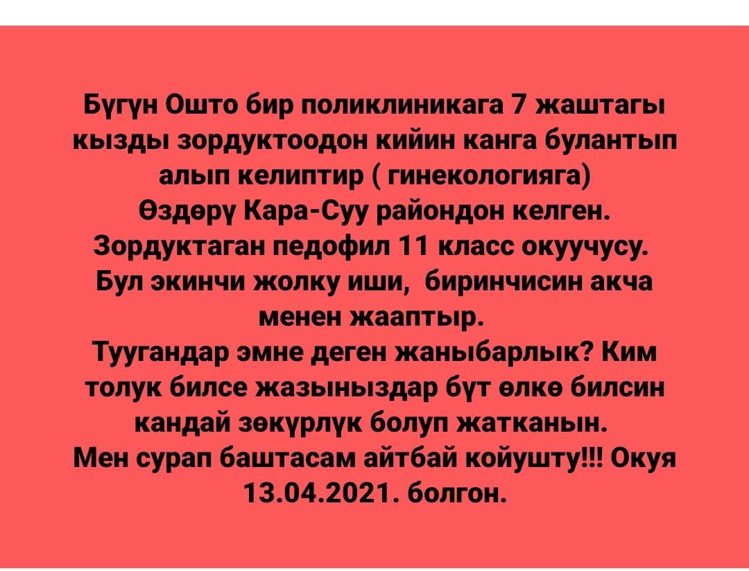 Буга чейин соцтармактарда Оштогу бейтапканага зордукталган 7 жаштагы кызды алып келишкени тууралуу маалымат тараган. Анда күбө окуя 13-апрелде болгонун, кызды зордуктаган бала 11-класстын окуучусу экенин жазган.