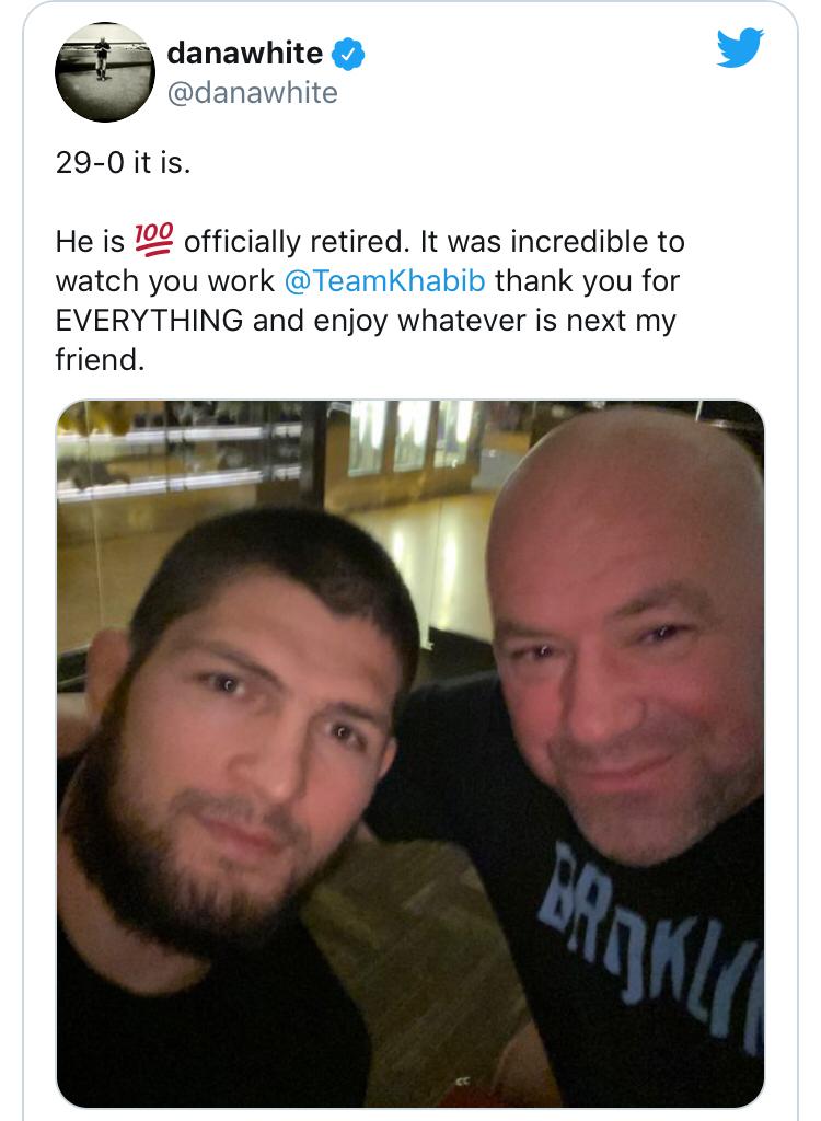 Россиялык мушкер, «UFC'нин» жеңил салмактагы чемпиону Хабиб Нурмагомедов расмий түрдө карьерасын жыйынтыктады. Бул тууралуу «UFC» мушташ уюмунун башчысы Дэйна Уайт билдирди.