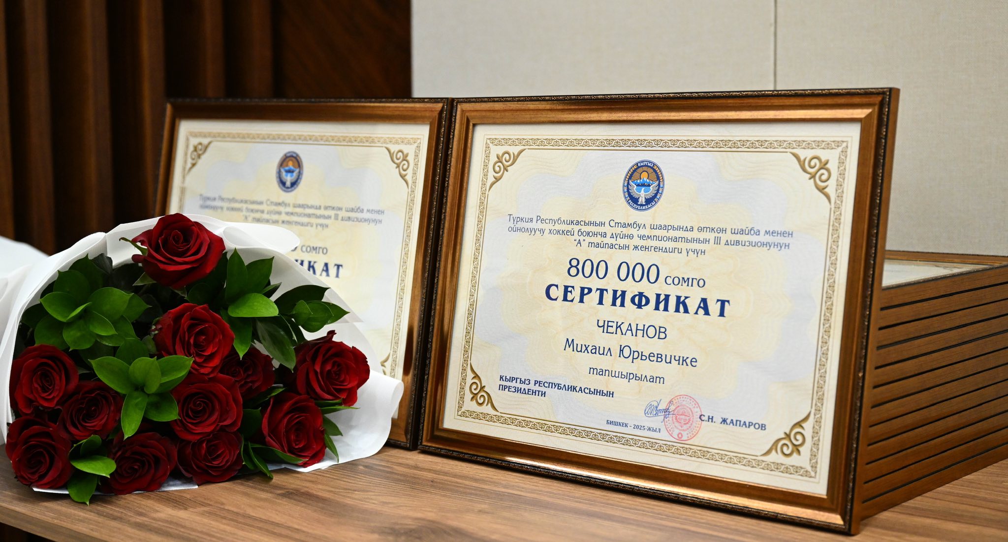 КООМ Садыр Жапаров хоккей боюнча улуттук курама команда мүчөлөрүнө акча сертификаттарын тапшырды 05:00 15.05.2025